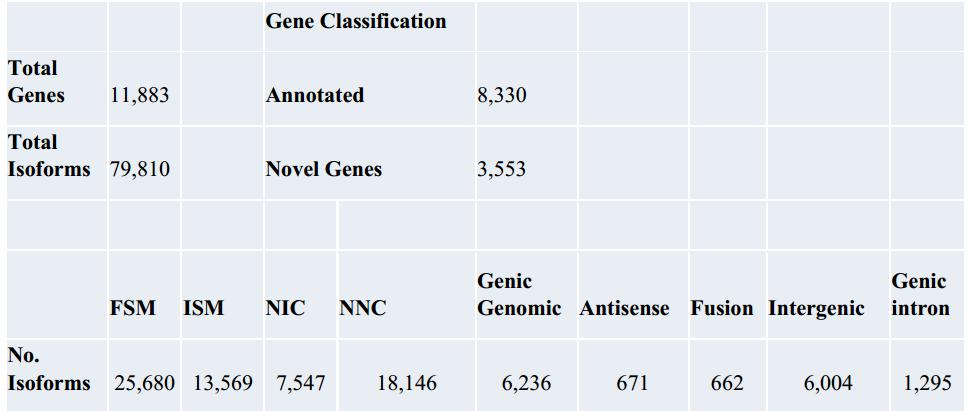 作者獲得了3100萬次reads,其中使用Canu對2200萬reads(71%)進行了錯誤糾正,只關注全長reads,通過確定為具有5’引物和poly(A)和3’引物的序列全長序列。ToFU轉錄組結果包含總共11,883個基因和79,810個亞型(表北京百邁客生物科技有限公司1),其中8330個基因與NCBI注釋基因匹配,而3553個基因是新的。所有這些都對應于橄欖蠅轉錄組在同種型水平上比當前NCBI注釋的四倍擴增。針對UniprotSwiss-prot數據庫的預測蛋白質序列的搜索顯示高比對的是雙翅目,其次是哺乳類動物(圖1B)。盡管鑒定了3553個新基因,但預計只有269個含有開放閱讀框。與注釋基因相比,超過50%的新基因是單外顯子,其中超過80%的基因是多外顯子并且還包含更高百分比的單同種型基因。且新基因的表達量要低于已注釋基因。在結構上,SQANTI根據其剪接點和基因組坐標將轉錄本分為9類,分別為FSM,ISM,NIC,NNC,基因組基因,反義,融合,基因間區(qū)和基因內含子(圖1E)。