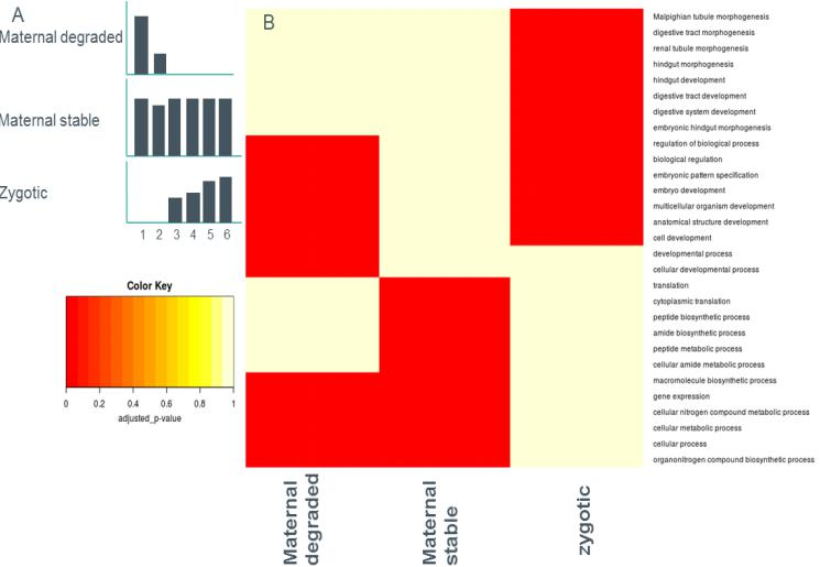 我們對3個類別基因集進行富集分析;母體降解基因,受精卵基因和母體穩(wěn)定/上調基因。母體降解基因也是1hpo中表達高的基因,富含細胞過程,發(fā)育和新陳代謝(圖6)。母體降解的基因也富含轉錄因子,例如DREF,BEAF-32A,PNR,它們是相應的果蠅同源基因。類似母體降解基因,母體穩(wěn)定/上調基因在翻譯,生物合成過程,基因表達,代謝過程等方面得到豐富,反映了快速生長胚胎的高代謝活性,DREF轉錄因子也在這些基因中富集。受精卵基因富含特定的組織形成和發(fā)展過程,包括:后腸發(fā)育,模式規(guī)范,消化道形態(tài)發(fā)生等功能。
