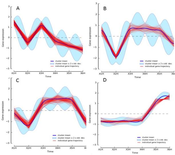 基因表達是一個嚴格調控的過程,在胚胎發(fā)育過程中,基因表達的時空動態(tài)調控對器官的正常發(fā)育至關重要?;谄鋾r間表達動力學的基因聚類不僅將表達基質的復雜性降低為簡單的基因集,而且還可以鑒定具有與先前所示相似的生物學功能的基因。實際上,我們鑒定了在不同時間點表達達到峰值的基因,證明了高度動態(tài)的轉錄本動力學,并表明這些基因在確定的發(fā)育期間具有特定的作用(圖7)。我們進一步將這些集群分為3組;1)基因在3hpo達到峰值并且通常隨時間降低,稱為早期基因(圖7A),2)基因,其表達維持3-5hpo,稱為中間基因(圖7B和C),和3)基因其表達僅在5和/或6hpo時增加,稱為晚期基因(圖7D)。富集顯示,如先前在母體類別的基因中所觀察到的,早期基因和中間基因在細胞過程和代謝過程中富集,而晚期基因在專門的發(fā)育過程中富集。