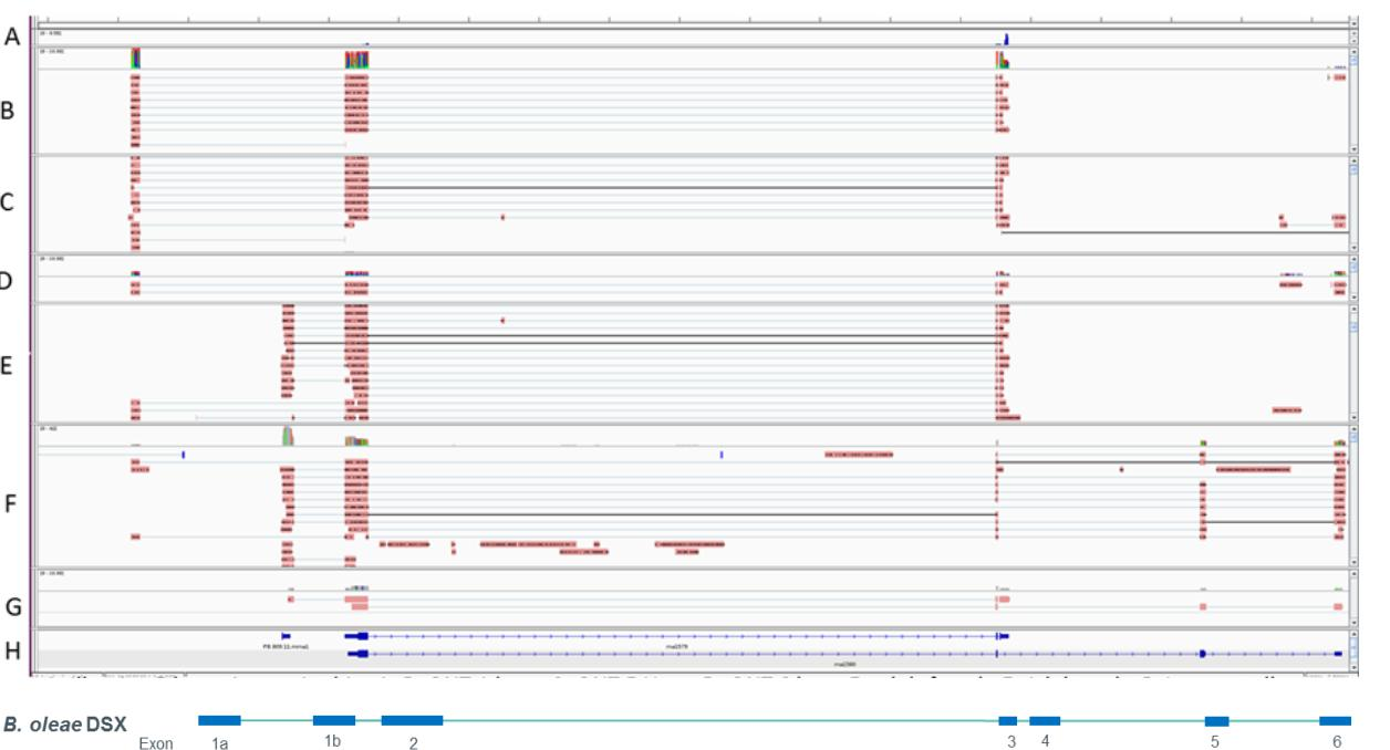 雙翅目昆蟲的性別決定機制在很大程度上是相同的,在果蠅(Drosophilamelanogaster)中,性別決定機制已被廣泛研究,性致死基因(sxl)作為主要調節(jié)因子,根據性染色體與常染色體的比例,調節(jié)本身和變異基因(tra)的性別特異性選擇性剪接。tra反過來調節(jié)性別特異性雙重性別的選擇性剪接(dsx),這是級聯的最后一個成員和性別差異發(fā)育的中介。B.oleae同源物已經鑒定了sx1,tra和dsx。然而,主要的調控方式仍然難以捉摸。已經提出橄欖蠅的性別決定在胚胎發(fā)育的前6小時內發(fā)生,并且通過類似于黑腹果蠅中的性別決定機制的tra和dsx的可變剪接來調控。在轉錄組數據中,我們能夠觀察到tra和dsx的各種可變剪接。使用來自成年雄性和雌性頭部的數據來識別性別特異性亞型。在dsx的情況下,與成齡相比,早期發(fā)育階段的亞型復雜性顯著不同。在數據中,看到具有不同轉錄起始位點和長度較長的亞型,因為在發(fā)育的早期胚胎階段存在突出的亞型(圖8),成齡頭部組織中的這些亞型轉移到較短的亞型中,外顯子4存在于雌性中但不存在于雄性中。由于我們無法在早期胚胎階段檢測到這些性別特異性亞型,我們認為它們的表達在發(fā)育過程后期開始。然而,它們在后期階段的積累代表了在發(fā)育早期階段激活的性別調控系統(tǒng)。北京百邁客生物科技有限公司。