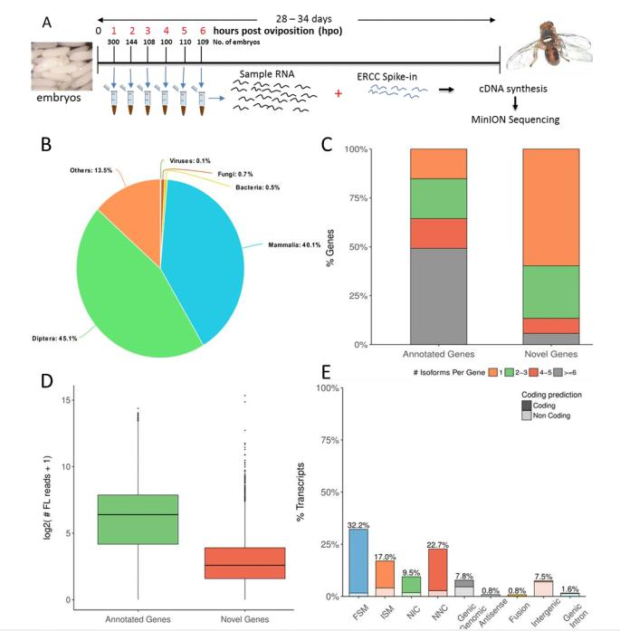 由于受精卵的興趣和令人費解的性質,胚胎發(fā)育已在模型生物中廣泛研究。然而,在生物中沒有很好表征,長讀長RNA-seq有可能揭示迄今未知的基因,完善注釋信息,并擴展亞型多樣性。作者匯集了混合性別橄欖果蠅(Bactroceraoleae)胚胎,這些胚胎在產卵的前6個小時后每小時收集一次。這些時期的研究很有意義,因為之前對B.oleae的研究表明,在此期間開始通過基因的可變剪接介導的性別決定機制。此外,來自地中海實蠅(Ceratitiscapitata)的證據表明,在此期間發(fā)生極細胞(原始生殖細胞)的建立,因此,在此期間闡明轉錄狀態(tài)非常重要。