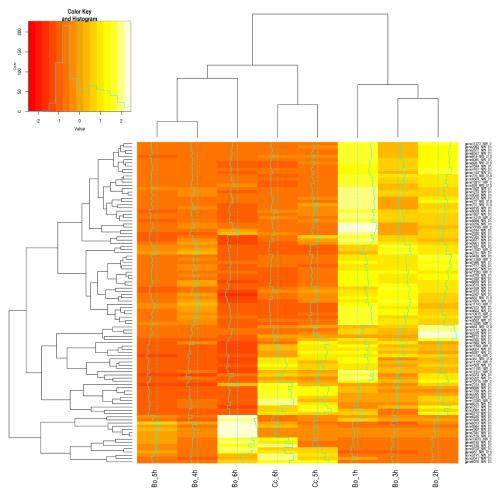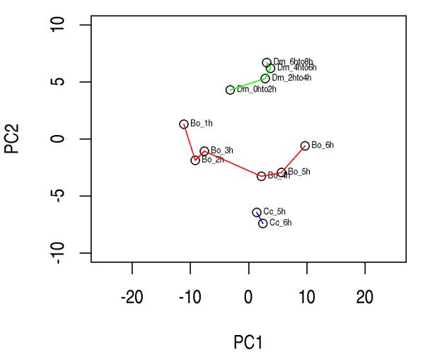 進一步尋求確定觀察到的表達模式是否可以在不同的生物樣品組中重復并使用實時定量PCR(qPCR),這是當前用于量化基因表達的標準方法。然而,qPCR基因表達的相對方法需要鑒定內參基因其表達在樣品間保持穩(wěn)定。使用作者的數據來確定這些常見內參基因以及GAPDH的表達水平的變化,評估了3個基因的qPCR表達;SRY,HID和LINGERER,用RPL19和14-3-3zeta作為內參基因,在不同的生物重復樣品組中(跳過6小時時間點)。我們觀察到類似的基因表達趨勢(特別是14-3-3zeta與RPL19相比)。為了進一步探索表達譜,我使用差異表達的明顯的基因進行主成分分析(PCA)和層次聚類分析,第一個主成分將前3個時間點與最后3個時間點分開,分層聚類進一步表明前3個和后3個時間點是分別共同聚類的。