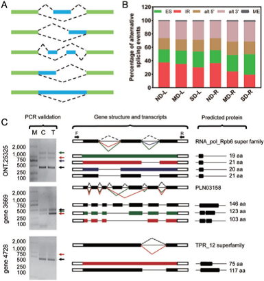 RNA-Seq檢測到的轉(zhuǎn)錄本與R.chinensis ‘Old Blush’基因組進行比對,鑒定剪接異構(gòu)體。如圖7 A所示,我們從非冗余轉(zhuǎn)錄本中檢測到42,544個可變剪接(As),包括12,096個內(nèi)含子保留(IRs)、12,914個選擇性3’剪接位點(alt 3’)、7,433個選擇性5’剪接位點(alt 5’)、9,406個外顯子跳過(ES)和695個互斥外顯子(ME)(圖7 A)。IR在玫瑰葉片中最為常見,在ND-L、MD-L、SD-L和ND-R樣品中的比例分別占34.77%、30.83%、30.1%和29.56%。而在SD脅迫下,ES是主要的AS模式(占所有AS事件的32.16%)。在MD-R中最常見的AS事件是alt 3’ (32.38%), ME(1.75%)是最罕見的(圖7 B)。為了進一步驗證新發(fā)現(xiàn)的轉(zhuǎn)錄組剪接異構(gòu)體,我們隨機選擇了三個至少注釋到兩個異構(gòu)體上的基因(ONT.25325、gene 3669和gene 4728)進行RT- PCR驗證。在這些基因的第一個外顯子和最后一個外顯子或適當區(qū)域設(shè)計引物。如圖7 C所示,片段的條帶大小與轉(zhuǎn)錄組數(shù)據(jù)中發(fā)現(xiàn)的剪接亞型的條帶大小一致。對推測的剪接異構(gòu)體進行克隆、測序和比對,以驗證剪接連接。例如,ONT. 25325編碼了一個putative protein,呈現(xiàn)出4個剪接亞型(圖7C),并隨后得到證實。此外,gene 3669和gene 4728顯示出相同的剪接變異。此外,一些剪接異構(gòu)體,如gene 3669,在對照和干旱脅迫下表現(xiàn)出差異。新的可變剪接體的鑒定進一步注釋了R.chinensis ‘Old Blush’基因組。