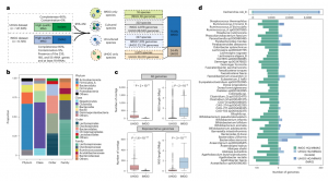 進一步深入探索了可用的高質(zhì)量基因組中編碼的代謝潛力。分析了 UHGG 和 IMGG 數(shù)據(jù)集中的高連續(xù)性和高質(zhì)量基因組。共從15512個基因組中還原了97428個MGC區(qū)域,其中78675個是完整的,并被納入進一步分析。這些完整的MGC屬于所有八個MGC類別,分布在58個MGC類型中。*常見的類別是SCFA(40.0%),其次是Putative(28.9%)和E-MGC(17.2%)。然后,門水平分布和聚類分析揭示了MGC類別的總體分布在門水平的顯著差異(圖4a),以及在十個主要的門之間,它們在不同門中的數(shù)量各不同(圖4a)。此外,基于涵蓋九個主要門的功能性MGC分類分布的特異性聚類表明,MGC概述和組成在門水平間存在顯著差異,這些未培養(yǎng)物種中的一些最近發(fā)現(xiàn)了以前未報告的Christensenellales和Oscillospirales分類群,突出了這些代表性不足的分類群在促進宿主健康方面的潛力(圖4c)。