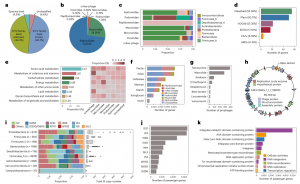 接下來,對IMGG數(shù)據(jù)庫中的前噬菌體基因組進行深入分析,以探究其功能能力。從12834個物種水平的vOTU代表性基因組中鑒定出596193個蛋白質(zhì)編碼基因,并將這些假定基因與幾個常見的功能和/或病毒注釋數(shù)據(jù)庫進行了比較。結(jié)果表明,僅有55.4%的前噬菌體基因在功能上能夠被分類,而44.6%的基因與任何交叉比較的數(shù)據(jù)庫都不具有同源性,被分配給了未知的功能(圖5d)。這些結(jié)果表明,盡管攜帶ARG的噬菌體很少存在于腸道微生物中,但這些噬菌體可能編碼ARG(例如,A163.CMAG_1_1_7_59800編碼假定的β-內(nèi)酰胺酶基因;圖5h),可能成為ARG轉(zhuǎn)移的關(guān)鍵載體,并對人類健康造成嚴重威脅。這些結(jié)果表明,腸道前噬菌體在分類和功能上比先前我們所了解的更加多樣化。