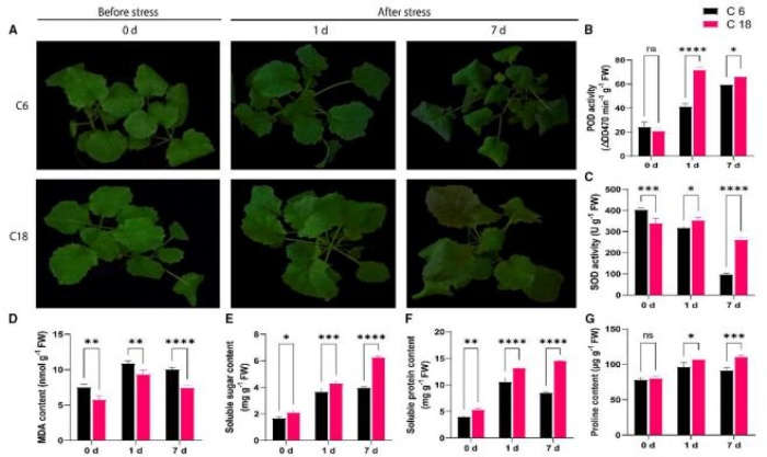 表型結(jié)果表明,C6 在冷處理 7 天時表現(xiàn)出比 C18 嚴(yán)重的萎蔫和褪綠。CT-C18 在第 1天和第 7 天的 SOD、POD 等抗氧化酶活性較高,C18 具有更好的抗氧化能力。并且 C18的可溶性糖、可溶性蛋白和脯氨酸含量都有顯著升高。以上的現(xiàn)象都表明 C18 可通過增加CS 的抗氧化防御酶活性和滲透保護劑含量,降低氧化應(yīng)激,是比 C6 更好的耐寒品種。