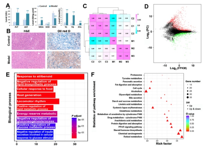 誘導小鼠發(fā)生NAFLD,結果顯示血清ALT、AST、TC、TG、FFA水平顯著升高;MDA、SOD和GSH水平的變化表明模型組小鼠肝臟的氧化應激狀態(tài)(圖1A)。通過H&E染色和油紅O染色觀察模型組肝組織病理改變和脂質堆積情況(圖1B)。