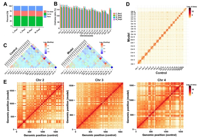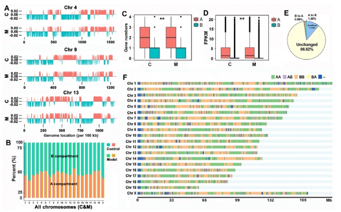 為了獲得三維染色質構象圖,作者對肝臟樣本的Hi-C文庫進行了測序,每組總共獲得超過477 Gb的數(shù)據(jù)。在去除PCR重復位點后,每個樣本獲得了超過8.02億對有效Hi-C數(shù)據(jù),測序深度為68.56%和68.96%,能夠以10 kb分辨率檢查C組和M組的相互作用。順反式相互作用的比例顯示,約四分之三的相互作用發(fā)生在染色體內,四分之一的相互作用發(fā)生在染色體間質(圖2A)。,這個頻率可以揭示染色體在基因組中的相互作用強度和染色體在細胞核中的相對位置。染色體之間的相互作用頻率熱圖如圖2C所示。通過熱圖顏色由對照組的藍色變?yōu)镹AFLD組的淺紅色,可以發(fā)現(xiàn)染色體Chr2與Chr5之間相互作用頻率的差異,提示NAFLD組兩染色體之間距離較近,相互作用較強。相比之下,觀察到的顏色從紅色變?yōu)樗{色,表明NAFLD組染色體之間的空間距離更遠,相互作用更弱,如Chr 7和Chr 11之間的相互作用。將各組的兩個Hi-C庫結合起來,進行對照組與模型組的對比分析。根據(jù)任意兩個bin之間覆蓋的Hi-C讀對的歸一化相互作用信號強度,繪制全基因組相互作用矩陣(圖2D),染色體內相互作用矩陣如圖所示。