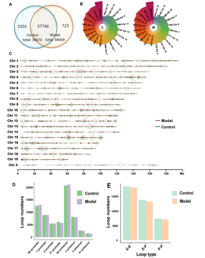 除了短程染色質相互作用外,3D基因組組織中的遠程環(huán)帶來了兩個線性分離的位點之間的物理接近。作者通過Hi-C接觸矩陣使用改進的HICCUP方法注釋染色質環(huán),分辨率為10 kb。結果顯示,與NAFLD發(fā)展相關的環(huán)的總數(shù)減少(從39,670到38,469,圖5A),而環(huán)的大小沒有變化(環(huán)的中位數(shù)長度為70 kb,支持信息圖S6A。每條染色體的環(huán)分布如圖5B和C所示,Chr 1上的環(huán)分布*多,對照組和模型組分別有3193個和3099個環(huán)(圖5B)。