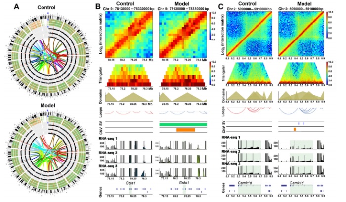 非酒精性脂肪性肝病(NAFLD)的3D基因組和基因組變異在很大程度上是未知的,盡管它們在細胞功能和生理過程中起著關鍵作用。在正常和NAFLD小鼠的肝臟上進行高通量染色體構象捕獲(Hi-C)、ONT測序和rna測序(RNA-seq)測定。生成高分辨率3D染色質相互作用圖,通過Hi-C檢測不同的3D基因組層次結構,包括A/B區(qū)室、拓撲相關結構域(TADs)和染色質環(huán),并檢測結構變異(SVs)和拷貝數(shù)變異(CNVs)的全基因組測序。在正常和NAFLD小鼠間,發(fā)現(xiàn)了基因組中數(shù)千個區(qū)域在3D染色質組織和基因組重排方面的變化,并揭示了基因調節(jié)異常經(jīng)常伴隨這些變化。在NAFLD中發(fā)現(xiàn)了候選靶基因,受基因重排和空間組織破壞的影響。作者的數(shù)據(jù)為NAFLD研究提供了高分辨率的三維基因組相互作用資源,揭示了遺傳重排、空間組織破壞和基因調控之間的關系,并確定了與NAFLD發(fā)病機制中這些變異相關的候選基因。這些新發(fā)現(xiàn)為NAFLD的發(fā)病機制提供了新的見解,并為NAFLD的治療提供了新的概念框架。