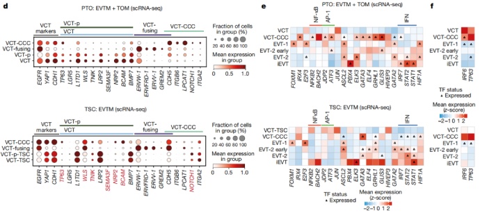 a.PTOs比TSCs更好地體現(xiàn)VCT的異質性。b.在PTOs中存在體內定義的四個VCT亞群,,它們表達相同的典型標志物。c.在PTO中,VCT-CCC在EVTM存在下富集,觸發(fā) FOXM1–NOTCH1 軸 NF-κB (NFKB2和BACH2)和AP-1調制器(JDP2和ATF3),相比之下,在TSC中找不到真正的VCT。D.在TSC和PTO中,VCT-CCC(CDH5,ITGB6和LCAT1)在EVTM培養(yǎng)基存在下富集,從而觸發(fā)NOTCH–FOXM1軸,導致 IRF6 進一步下調和 EVT-1 中的 TP6323。