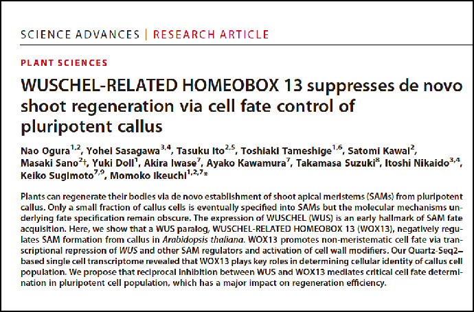 研究基于單細(xì)胞轉(zhuǎn)錄組測(cè)序技術(shù),表明WOX13在愈傷組織細(xì)胞群體的細(xì)胞身份確定中發(fā)揮關(guān)鍵作用。發(fā)現(xiàn)WUS和WOX13之間的相互抑制介導(dǎo)了多功能干細(xì)胞群體中臨界細(xì)胞命運(yùn)的決定,這對(duì)新生芽的再生效率有重要影響。