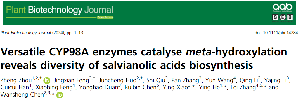 2024年1月16日,海軍軍醫(yī)大學(xué)陳萬生與張磊團(tuán)隊(duì)合作在植物學(xué)領(lǐng)域國際一流學(xué)術(shù)期刊《植物生物技術(shù)》Plant Biotechnology Journal發(fā)表一項(xiàng)最新研究成果,題為:Versatile CYP98A enzymes catalyse meta-hydroxylation reveals diversity of salvianolic acids biosynthesis。本研究以富含丹酚酸的代表性重要藥用植物丹參為研究對(duì)象,闡明了丹酚酸生物合成的多樣性,為CYP98A酶在間位羥基化反應(yīng)中催化特異性的通用性提供了新的見解,同時(shí)也證明CYP98A酶是利用代謝工程策略提高丹酚酸含量的理想操作靶點(diǎn)。中藥丹參為唇形科鼠尾草屬植物丹參(Salvia miltiorrhiza Bge.)的干燥根和根莖,是我國常用中藥。丹參藥用歷史悠久,始載于中國傳統(tǒng)醫(yī)藥學(xué)典籍《神農(nóng)本草經(jīng)》,具有祛疲止痛、活血通經(jīng)、清心除煩之功效。丹參作為復(fù)方丹參滴丸、復(fù)方丹參片、丹紅注射液等藥物的原料,廣泛應(yīng)用于心、腦血管疾病的治療,丹參藥材的年使用量超萬噸,屬于大宗常用中藥材。丹參有效成分主要包括脂溶性的丹參酮類化合物和水溶性的丹酚酸類化合物。