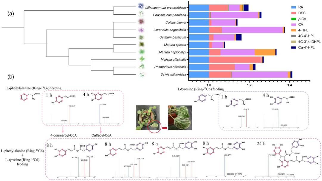 丹參中酪氨酸衍生的途徑從未被報(bào)道過,丹參素(DSS)是否參與SA生物合成仍然未知。SA的生物合成可能是多樣化的,作者在同位素標(biāo)記的喂養(yǎng)實(shí)驗(yàn)去驗(yàn)證這一結(jié)論。含有同位素標(biāo)記的 L-苯丙氨酸和 L-酪氨酸浸潤3個(gè)月大的丹參葉子中。從不同時(shí)間點(diǎn)收集的葉片中提取SA,并使用UPLC-Q-TOF/MS進(jìn)行分析。結(jié)果顯示,在p-CA、CA、4-HPL、DSS、SAB和RA及其前體(包括4C-4′-HPL、4C-3′、4′-DHPL和Ca-4′-HPL)均被檢測(cè)出標(biāo)記(圖1b)。這些結(jié)果驗(yàn)證了作者的推測(cè),即不同的酰基供體,包括4C-CoA和CA-CoA以及含有4-HPL和DSS的酰基受體參與SA的形成。SA的生物合成途徑是多種多樣的。