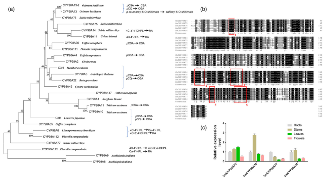 從SmCYP98A亞家族中鑒定出4種酶,分別是SmCYP98A75、SmCYP98A76、SmCYP98A77和SmCYP98A14。SmCYP98A家族酶能催化羥基肉桂酸酯的間羥基化形成RA,說明它們屬于4-香豆酰酯3-羥化酶(C3H)家族。通過鄰連接樹(NJ樹)分析,SmCYP98A酶與C3H之間的系統(tǒng)發(fā)育關(guān)系(圖2a)。結(jié)果表明,SmCYP98A75與SmCYP98A14和CbCYP98A14具有更顯著的序列同源性。而SmCYP98A77與其他CYP98A成員同源性較低。四種SmCYP98A 酶的氨基酸序列包含 P450 單加氧酶的幾個(gè)特征基序,例如 PERF 基序、血紅素結(jié)合半胱氨酸基序和含蘇氨酸的結(jié)合口袋(圖2b)。