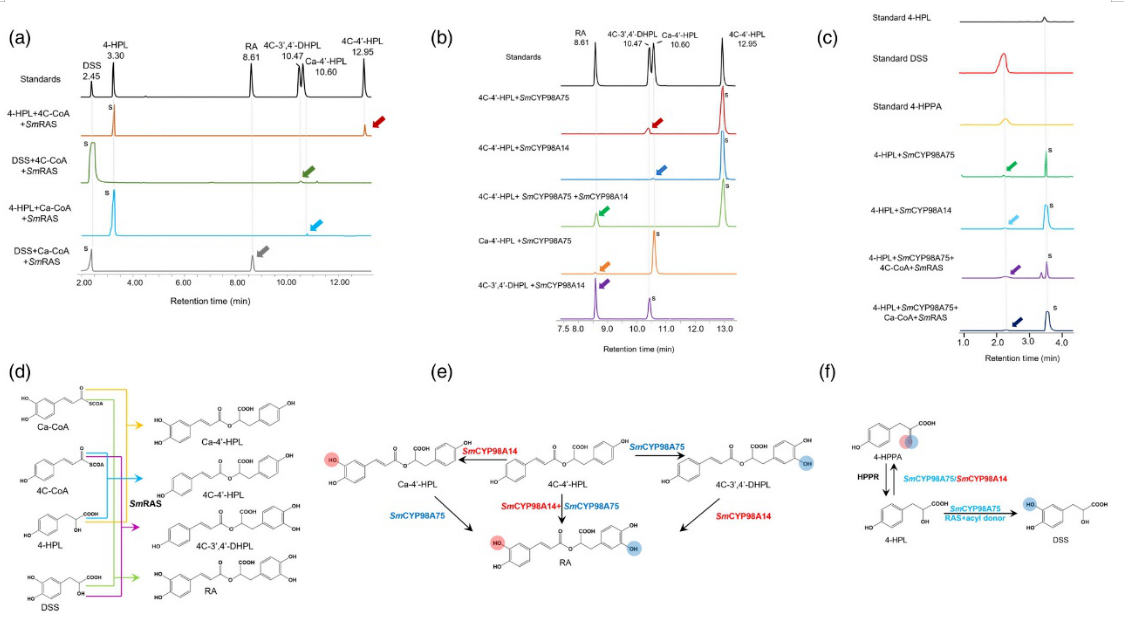 上述研究表明SmCYP98A75負(fù)責(zé)RA生物合成中酰基受體部分的 C-3′羥基化,因此作者推測(cè)SmCYP98A 酶可能在丹參素DSS形成中發(fā)揮重要作用。體外酶活實(shí)驗(yàn)表明,當(dāng)SmCYP98A75或SmCYP98A14與4-HPL一起孵育時(shí),在產(chǎn)物中檢測(cè)到4-HPPA,說明這兩種酶表現(xiàn)出將4-HPL的側(cè)鏈羥基直接氧化為酮的能力。然而,在兩個(gè)反應(yīng)系統(tǒng)中均未檢測(cè)到DSS。作者認(rèn)為植物內(nèi)部生物合成環(huán)境是復(fù)雜的,包括許多代謝途徑和催化酶,在反應(yīng)體系中加入?;w和SmRAS,以模擬丹參的DSS生物合成。與SmRAS和4C-CoA或Ca-CoA孵育后,僅在SmCYP98A75催化的反應(yīng)中產(chǎn)生DSS(圖3c,f)。