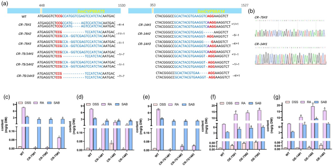為了進(jìn)一步研究SmCYP98A75和SmCYP98A14在SA生物合成中的作用,作者利用CRISPR/Cas9技術(shù)生成了SmCYP98A75和SmCYP98A14單突變體和雙突變體。純合突變體用于分析SA積累(圖4a,b)。與WT相比,突變體顯示出更低的SA積累。SmCYP98A75 和SmCYP98A14 突變體的DSS、RA和SAB水平降低,尤其是SmCYP98A75突變體中幾乎檢測(cè)不到DSS。與WT相比,雙突變體中DSS和RA幾乎檢測(cè)不到,表明CYP98A成員在SA生物合成中都起著重要作用(圖4c-e)。進(jìn)一步檢測(cè)SA生物合成途徑中關(guān)鍵酶的表達(dá)水平,包括SmPAL、SmC4H、Sm4CL、SmTAT、SmHPPR和SmRAS在突變體毛根中的表達(dá)。結(jié)果表明,與WT相比,SmCYP98A75 和SmCYP98A14單突變系和雙突變系中SmPAL、SmC4H、SmTAT和SmRAS 的轉(zhuǎn)錄水平顯著降低。