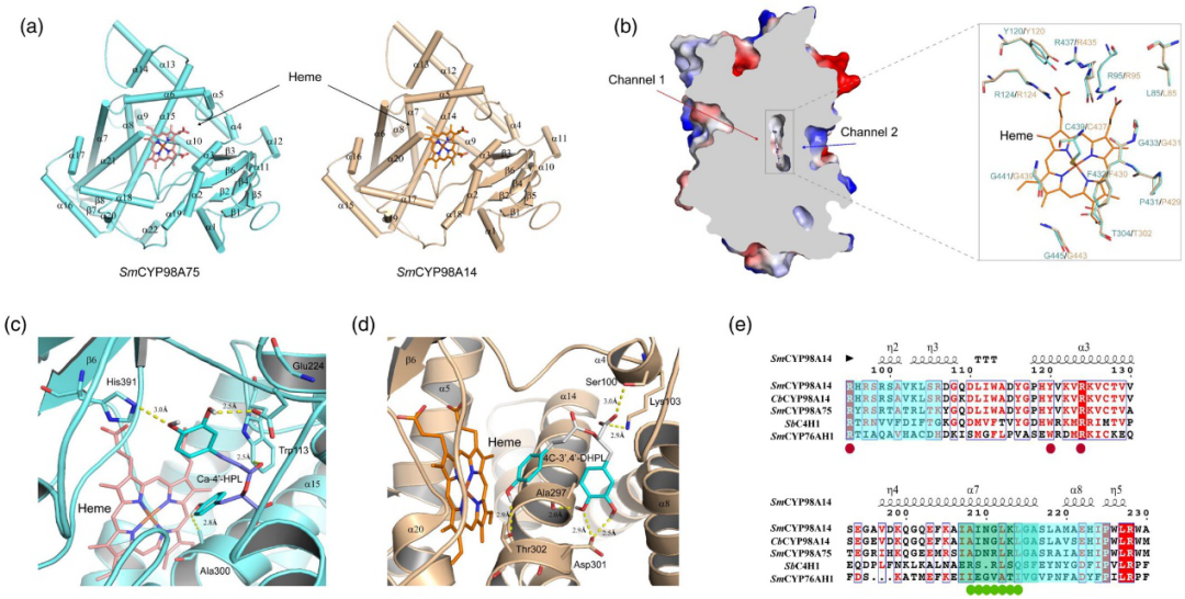 SmCYP98A75和SmCYP9814底物特異性的差異為研究底物識(shí)別和代謝的結(jié)構(gòu)特征提供了機(jī)會(huì)。使用在線SWISS-MODEL進(jìn)行同源建模。SmCYP98A75和SmCYP98A14的整體結(jié)構(gòu)模型高度相似,表明兩種SmCYP98A的底物識(shí)別和代謝是保守的。SmCYP98A75的整體結(jié)構(gòu)模型包含22個(gè)α螺旋和8個(gè)β鏈,SmCYP98A14的整體結(jié)構(gòu)模型包含20個(gè)α螺旋和6個(gè)β鏈,與 SmCYP98A14 高度相似(圖5a)。在結(jié)構(gòu)模型中觀察到血紅素分子與兩個(gè) SmCYP98A 的活性結(jié)合口袋。通過與口袋內(nèi)殘基的多次相互作用,它被穩(wěn)定在正確的位置。兩種SmCYP98A和CbCYP98A14的血紅素包圍基序和關(guān)鍵催化氨基酸是高度保守的(圖5b)。基于與已知 P450 的疊加,通道 1 可能容納底物進(jìn)入和產(chǎn)物,而通道 2 可能使血紅素能夠進(jìn)入水和質(zhì)子。