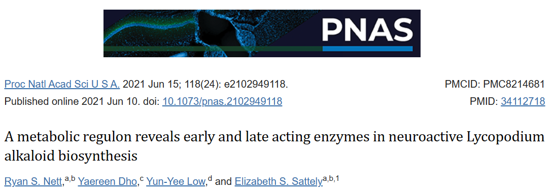 2021年6月,斯坦福大學(xué) Elizabeth S. Sattely 團(tuán)隊(duì)在國際頂尖學(xué)術(shù)期刊《美國國家科學(xué)院院刊》PNAS發(fā)表一項(xiàng)重要研究成果,題為:A metabolic regulon reveals early and late acting enzymes in neuroactive Lycopodium alkaloid biosynthesis。研究通過代謝組學(xué)和轉(zhuǎn)錄組學(xué)的方法,確定了一組發(fā)育受控的生物合成基因,或潛在的調(diào)節(jié)子,用于調(diào)控石松生物堿的生物合成。