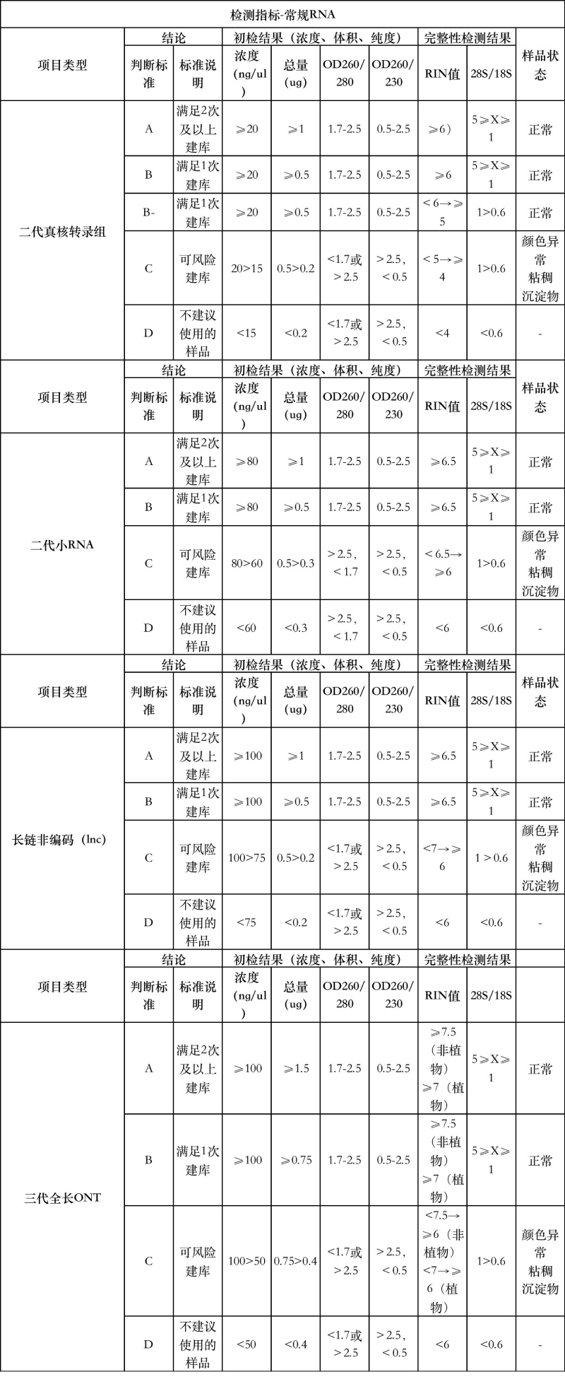 2、以上均是單個文庫的總量要求,如果樣品做多個文庫按(小 RNA>LNCRNA>轉(zhuǎn)錄組 RNA)判??偭坎蛔愕奈膸煊袠悠放?C 不通過,無不合格原因,根據(jù)二次提取的總量判定。無樣品根據(jù)剩余總量判判定下一文庫。