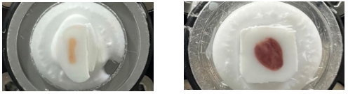 - 將包含組織和OCT的包埋盒放在干冰粒上輕輕按壓(如下圖,左),確保水平(否則會影響組織的方向,同時能保證干冰粒與包埋塊的接觸面積最大以達到快速降溫的效果),直到包埋塊完全凍結(jié)變白(如下圖,右)。