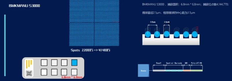 發(fā)布會中,百邁客生物智能制造副總裁劉敏對百創(chuàng)S3000空間轉(zhuǎn)錄芯片的性能進行了詳細介紹。百創(chuàng)S3000在6.8mm*6.8mm的捕獲區(qū)域內(nèi)鋪設了4,144,770個捕獲位點,相鄰兩個捕獲位點的中心距為3.5μm。相較于現(xiàn)在廣受市場認可與好評的百創(chuàng)S1000轉(zhuǎn)錄組芯片,捕獲位點數(shù)提升近2倍,分辨率同樣提升近2倍。