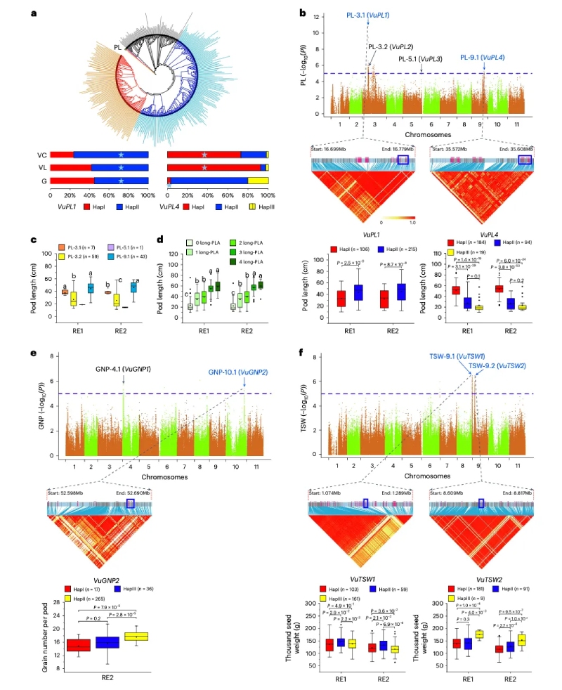 產(chǎn)量相關(guān)基因和品質(zhì)相關(guān)基因在3個亞群體(G、VL和VC)中的多態(tài)性和分布揭示了豇豆表型分化的遺傳基礎(chǔ)。莢長(PL)、單莢粒數(shù)(GNP)和千粒重(TSW)是影響豇豆產(chǎn)量的重要因素,G亞群的PL通常比VL和VC亞群的PL短得多(圖5a)。GWAS分析挖掘到與這3個性狀相關(guān)的位點和候選基因,并對候選基因單倍型及其表達分析,發(fā)現(xiàn)PL差異可能是由于VuPL1-HapII 和 VuPL4-HapI (圖5b) 在豇豆馴化和改良過程中強烈選擇引起的。在重組自交系(RIL)群體中進一步驗證了VuPL1和VuPL4的功能,發(fā)現(xiàn)VuPL1似乎比VuPL4在該群體中具有更強的作用。同時基因表達分析發(fā)現(xiàn)WAKs基因可能以劑量/轉(zhuǎn)錄依賴的方式導致PL差異。糧用豇豆的GNP也通常比菜用豇豆的低,可能是VuGNP2-HapIII這一有利單倍型引起的(圖5e)。TSW則可能與VuTSW1和VuTSW2基因的有利單倍型有關(guān)(圖5f),其功能也分別在RIL群體和F2群體中得到進一步驗證。