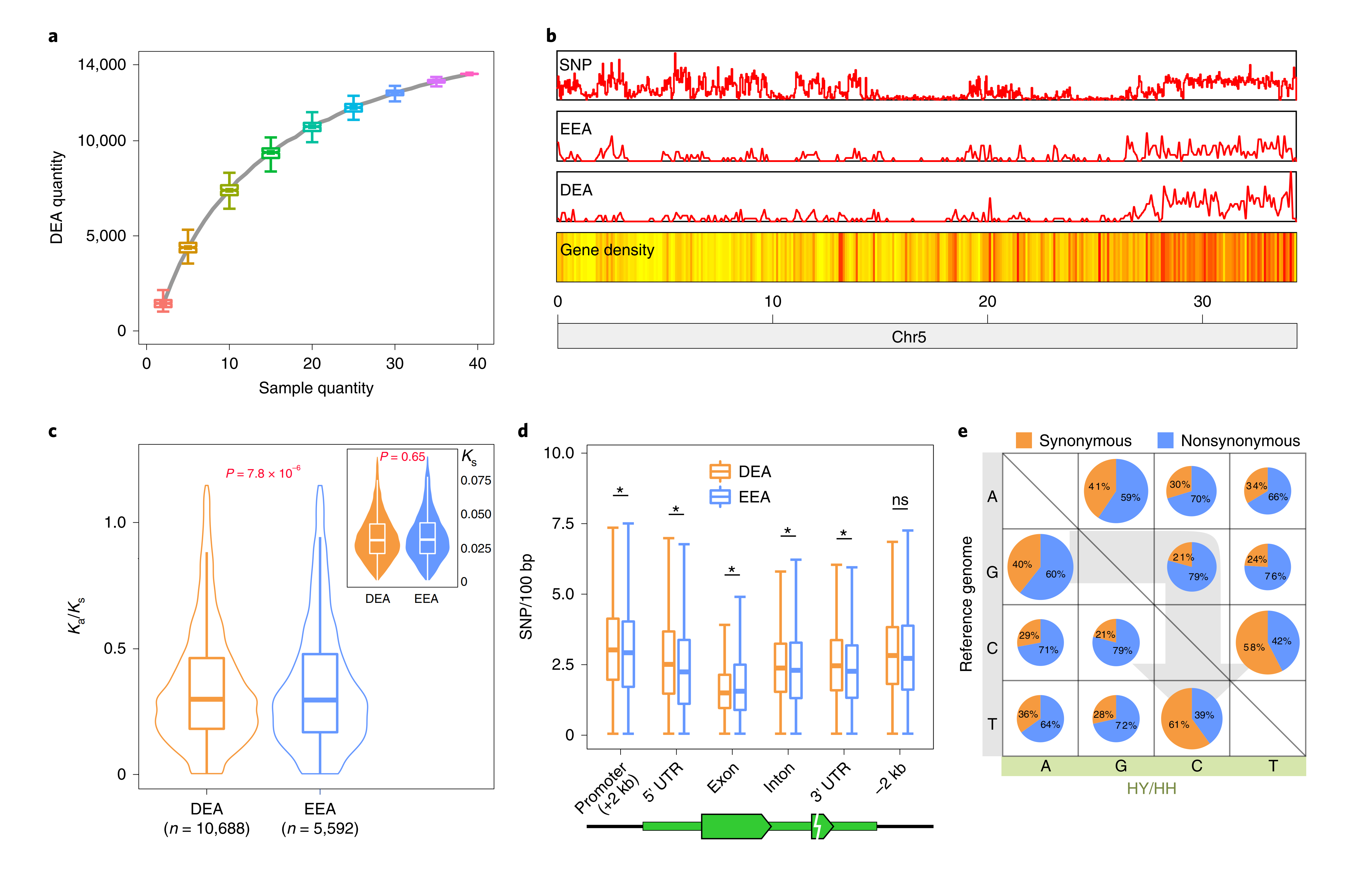 作者通過SNP分型和單細(xì)胞10x?Gemomics測序,利用“妃子笑”荔枝的高雜合性(2.27%),成功獲得的兩個(gè)單倍型的基因組(云南單倍型,HY;海南單倍型,HH)。對(duì)39個(gè)妃子笑”不同組織和時(shí)期樣本進(jìn)行轉(zhuǎn)錄組測序分析,共鑒定到13517個(gè)等位差異表達(dá)基因(DEA)。DEA在基因組上的分布并不是均勻的,在某些區(qū)域具有集中現(xiàn)象,可能與特定的生物學(xué)過程相關(guān)。還發(fā)現(xiàn),DEA和等位等量表達(dá)基因(EEA)具有相同的Ks值,但是DEA經(jīng)受更強(qiáng)的選擇壓力。