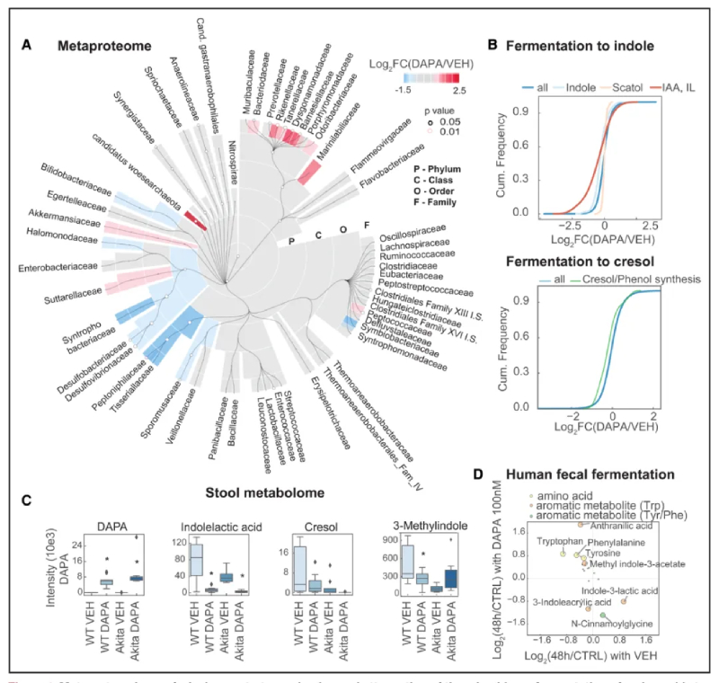 使用苯丙氨酸等芳香族氨基酸作為底物可以減少甲酚和苯酚的生成劑(圖4B)。糞便代謝組檢測表明顯示糞便中存在達格列凈(圖4C)。在達格列凈治療小鼠的這些糞便樣本中,色氨酸和苯丙氨酸發(fā)酵的代謝物有所減少(圖4C)。為了探究達格列凈在糞便中的直接作用,將SGLT2i添加到人糞便中。厭氧發(fā)酵后,發(fā)現(xiàn)吲哚乳酸、色氨酸代謝物和肉桂酰甘氨酸減少(圖4D);也就是說,與WT小鼠血漿中SGLT2i 減少的化合物相關的化合物(圖3F)。在人體糞便發(fā)酵中添加SGLT2i也逆轉(zhuǎn)了這些毒素母體分子的消失,特別是芳香族氨基酸色氨酸、酪氨酸和苯丙氨酸(圖4D)。