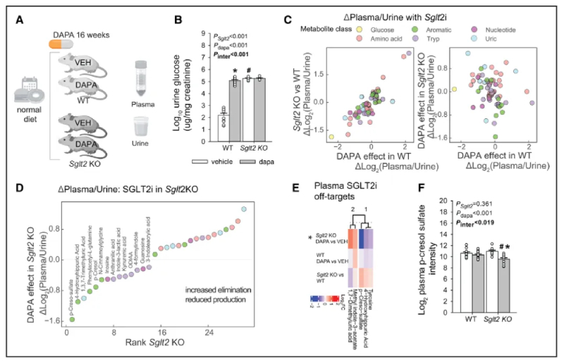 在SGLT2 KO和WT小鼠中,許多代謝物的比率發(fā)生了類似的變化,就像在WT小鼠中使用達格列凈和溶劑處理一樣(圖5C左圖),這表明SGLT2抑制的后果。在其他方面,葡萄糖比率的下降,反映了尿糖排泄的增加。正如預期的那樣,SGLT2的缺失阻斷了達格列凈對葡萄糖排泄的影響(圖5C右圖)。另一方面,達格列凈顯著改變了SGLT2 KO小鼠體內(nèi)許多代謝物的比例,表明了一種偏離靶點的效應(圖5D)。血漿:尿液比例的排名變化顯示,達格列凈降低了SGLT2 KO小鼠中多種芳香酸代謝物的比例,包括甲酚和馬尿酸鹽,其次是色氨酸代謝物。血漿水平分析確定了SGLT2i在SGLT2 KO環(huán)境中顯著改變的5種代謝物,包括PCL硫酸鹽和一種修飾的馬尿酸(圖5E和5F)。該實驗表明SGLT2i治療具有非靶點效應,包括對甲酚、馬尿酸鹽和色氨酸代謝物。