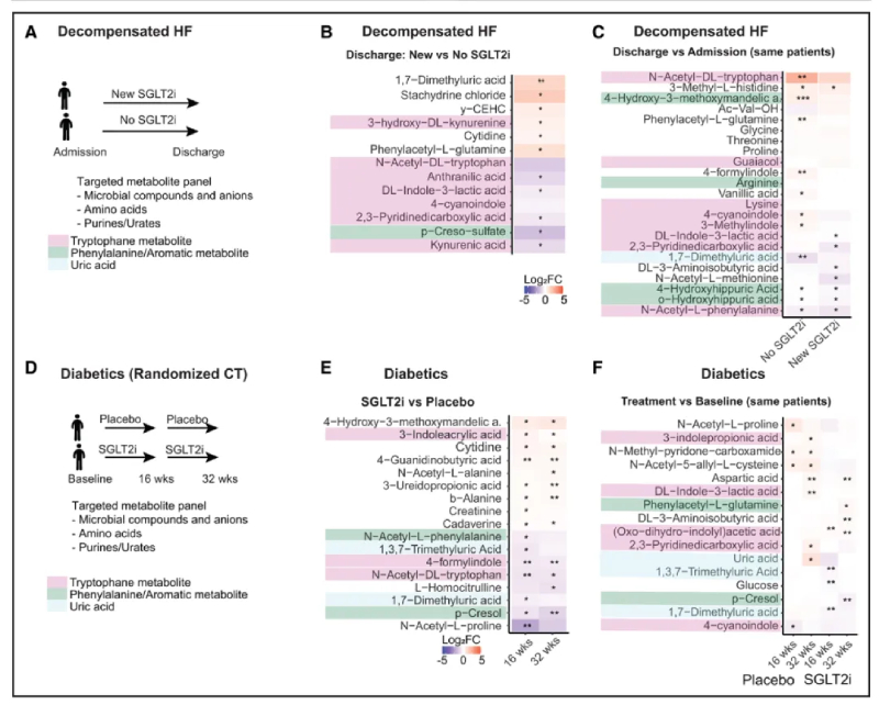 鑒于腎臟SGLT2相互作用組以及微生物對SGLT2i的反應在小鼠和人類中相似,我們想知道SGLT2i是否會影響循環(huán)中的溶質(zhì),在縱向數(shù)據(jù)中與心血管相關。對來自2個獨立研究的患者的血漿樣本進行了靶向代謝組分析,目標是80個有機陰離子和尿毒癥毒素。在第一組>40名患者中,在失代償性心衰的真實環(huán)境中分析了這種影響(圖6A)。結(jié)果表明,SGLT2i顯著降低或鈍化了心力衰竭患者血漿中幾種有機陰離子的增加,但僅當住院期間添加SGLT2i時(圖6B和6C)。包括幾種色氨酸代謝物,如ILA、犬尿酸和乙酰色氨酸,以及苯丙氨酸代謝物苯乙酰谷氨酰胺和PCL硫酸鹽。分析了在糖尿病患者中使用SGLT2I(依帕列凈)的隨機對照試驗的縱向數(shù)據(jù)(圖6D)。與基線和安慰劑相比,二甲基尿酸和三甲基尿酸的血漿濃度降低,PCL降低,吲哚代謝物增加緩慢(圖6E和6F)。在兩項臨床研究中,降低的溶質(zhì)大部分來自嘌呤代謝和腸道芳香氨基酸代謝,這與在小鼠身上觀察到的代謝器官一致。