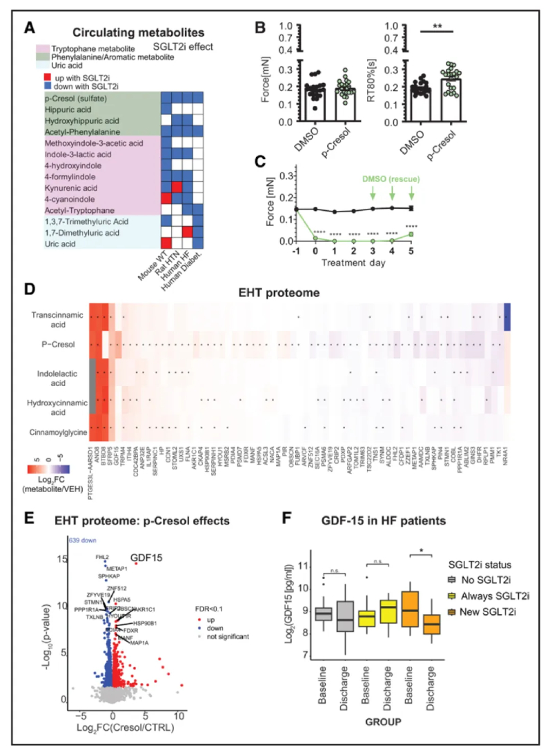 為了進一步闡明該機制,對用300μM PCL、吲哚乳酸和3種其他芳香族代謝物處理的 EHT 組織進行了蛋白質(zhì)組學分析(圖7D)。觀察到最強烈的變化是 PCL 的反應(圖7D)。多種蛋白質(zhì)的增加包括心臟病相關通道TRPM4、 FLNA和生長因子CCN1;減少的蛋白質(zhì)包括 PPP1R1A,其下調(diào)已被報道為人類HF的標志。PCL改變的蛋白質(zhì)組的一個獨特特征是心臟肌節(jié)相關蛋白的減少(圖S7D),以及應激信號 GDF15的強烈感應(圖7E)。考慮到HF患者中該通路的調(diào)節(jié),檢測了GDF15 水平,發(fā)現(xiàn)接受SGLT2i治療心力衰竭的患者循環(huán) GDF15 減少(圖7F)。