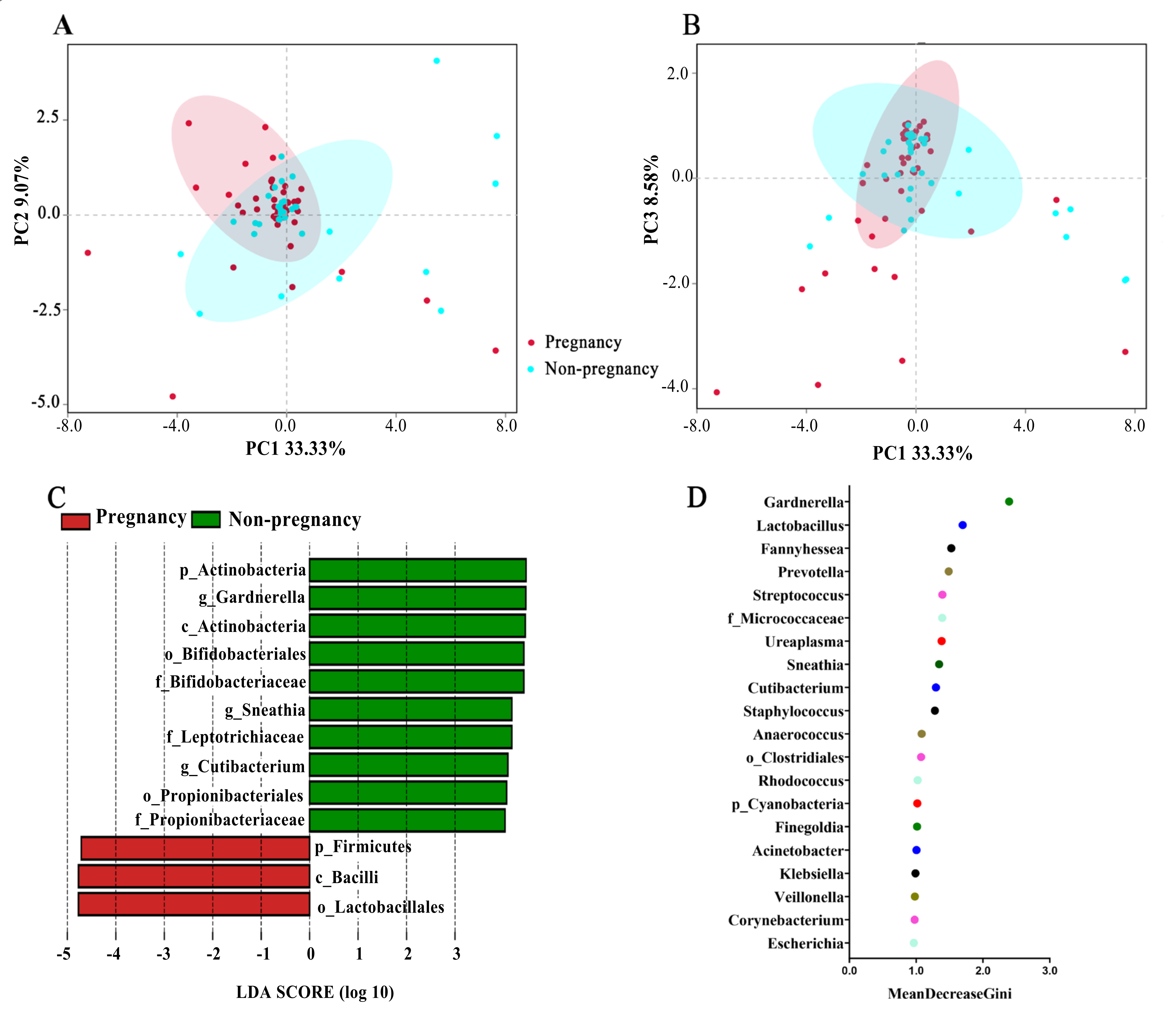 對陰道拭子進(jìn)行微生物多樣性測序分析。結(jié)果表明,在屬水平上,豐度最高的最常見細(xì)菌是Lactobacilli、Gardnerella(8.57%)、Streptococcus?(1.79%)和Atopobium(1.54%)。PCoA顯示這兩組的陰道微生物群落結(jié)構(gòu)略有不同;Lefse分析表明,妊娠組乳乳酸桿菌(Lactobacillus)豐度高于非妊娠組。非妊娠組中放線菌門和加德納菌屬的豐度高于妊娠組。在屬水平上,潛在生物標(biāo)志物包括?Gardnerella、Lactobacil-lus和Fannyhessea,(圖2D)。妊娠組加德納菌的相對豐度顯著低于未妊娠組。