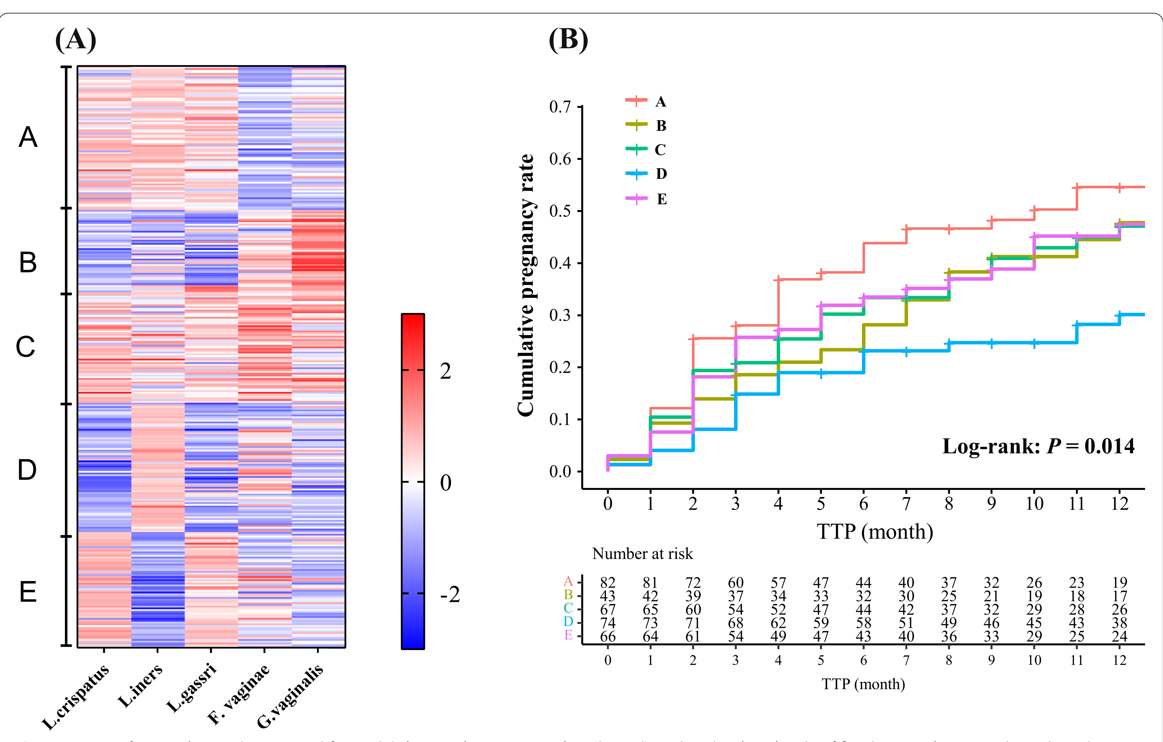 根據(jù)五種細(xì)菌的絕對負(fù)荷量,發(fā)現(xiàn)陰道微生物群聚為五種類型(A-E)。圖4A顯示A型(24.7%,82/332)以三種高豐度乳桿菌和低豐度的G.vaginalis和F.vaginae為特征。B型(13.0%,43/332)表現(xiàn)為G.vaginalis高豐度,三種乳桿菌豐度低。C型(20.2%,67/332)以高豐度F.vaginae為主和適度豐富的三種乳桿菌。D型(22.3%,74/332)的特征是Liners豐度較高,其余4種豐度較低。E型(19.9%,66/332)表現(xiàn)為L. crispatus和L.gasseri豐度較高,其他三種豐度較低。圖4B顯示,具有不同類型陰道微生物群的婦女具有不同的生育能力。A型陰道微生物組的累積妊娠率最高,而D型陰道微生物組的累積妊娠率最低。B型、C型和E型的累積妊娠率相似。