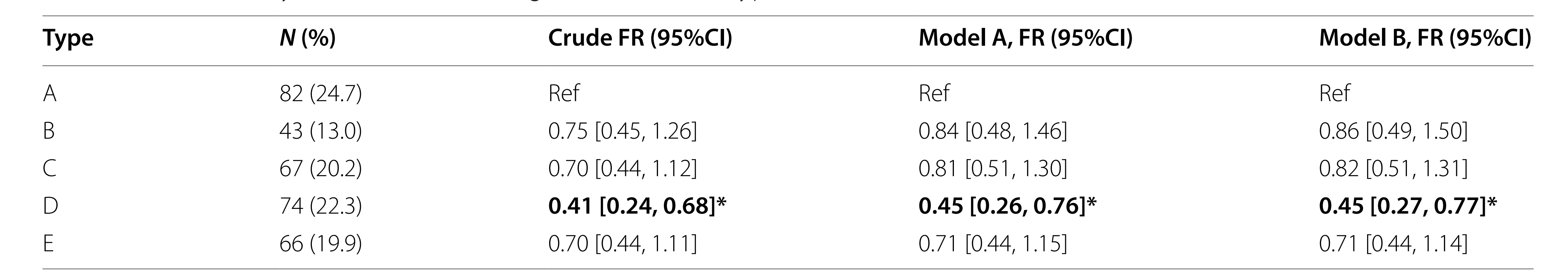 在調(diào)整了潛在的混雜因素后,與陰道微生物群A型的女性相比,D型微生物組的生育能力降低了55%。無論TTP是按月還是按月經(jīng)周期決定,這種相關(guān)性都很強(qiáng)。與A型相比,具有B、C和E型陰道微生物組的婦女的生育能力傾向較低。