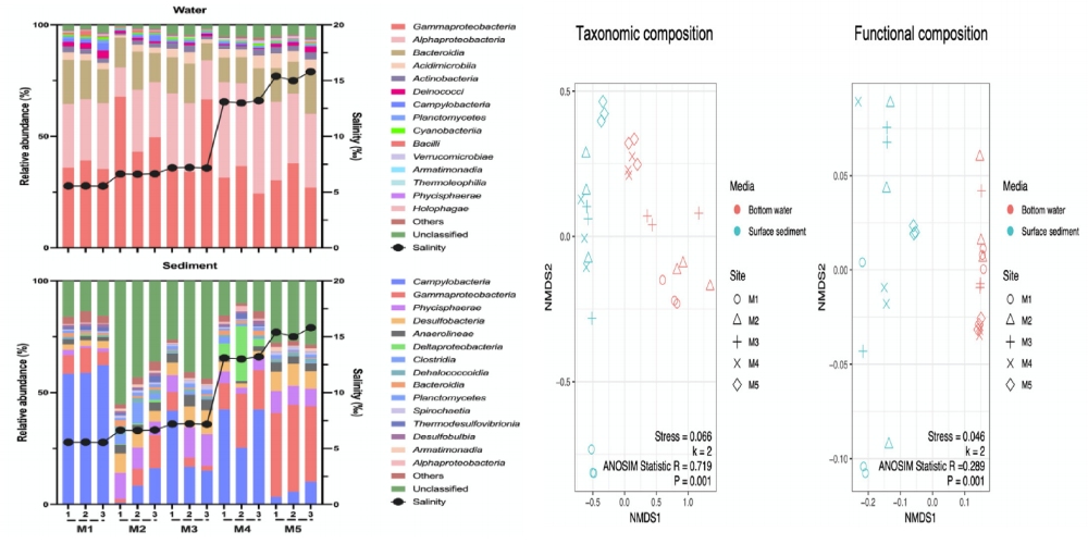 - 水中的優(yōu)勢細(xì)菌類群是Gammaproteobacteria、Alphaproteobacteria和Bacteroidia,而沉積物中的優(yōu)勢細(xì)菌類群是Campylobacteria,γ變形菌和德爾塔變形菌;
