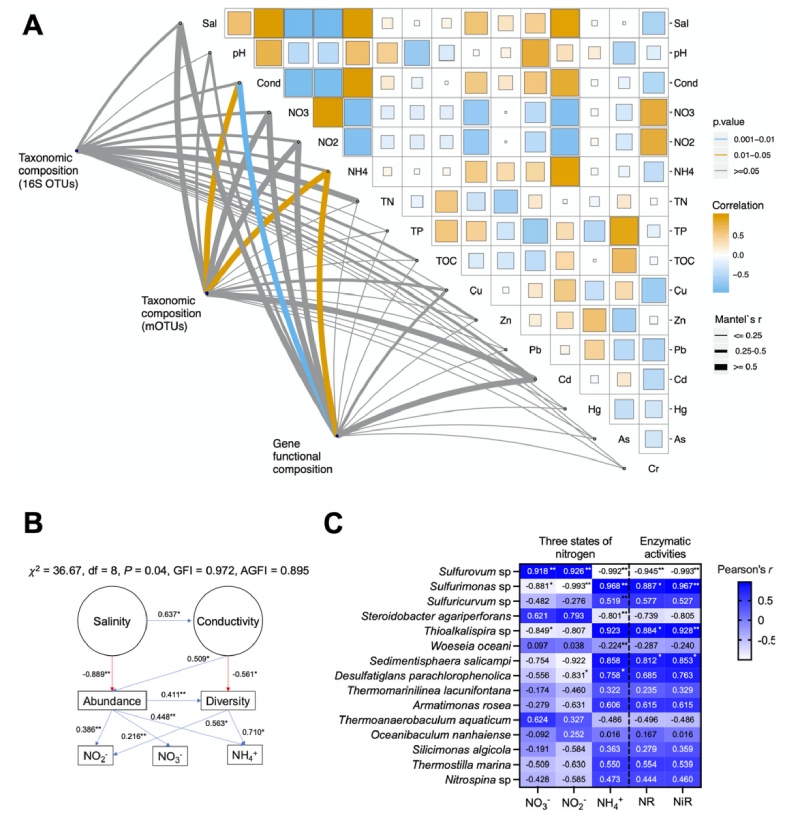 - 鹽度、電導(dǎo)率和細(xì)菌豐度之間存在正相關(guān)關(guān)系,沉積物中不同的氮形態(tài)有順序的參與;