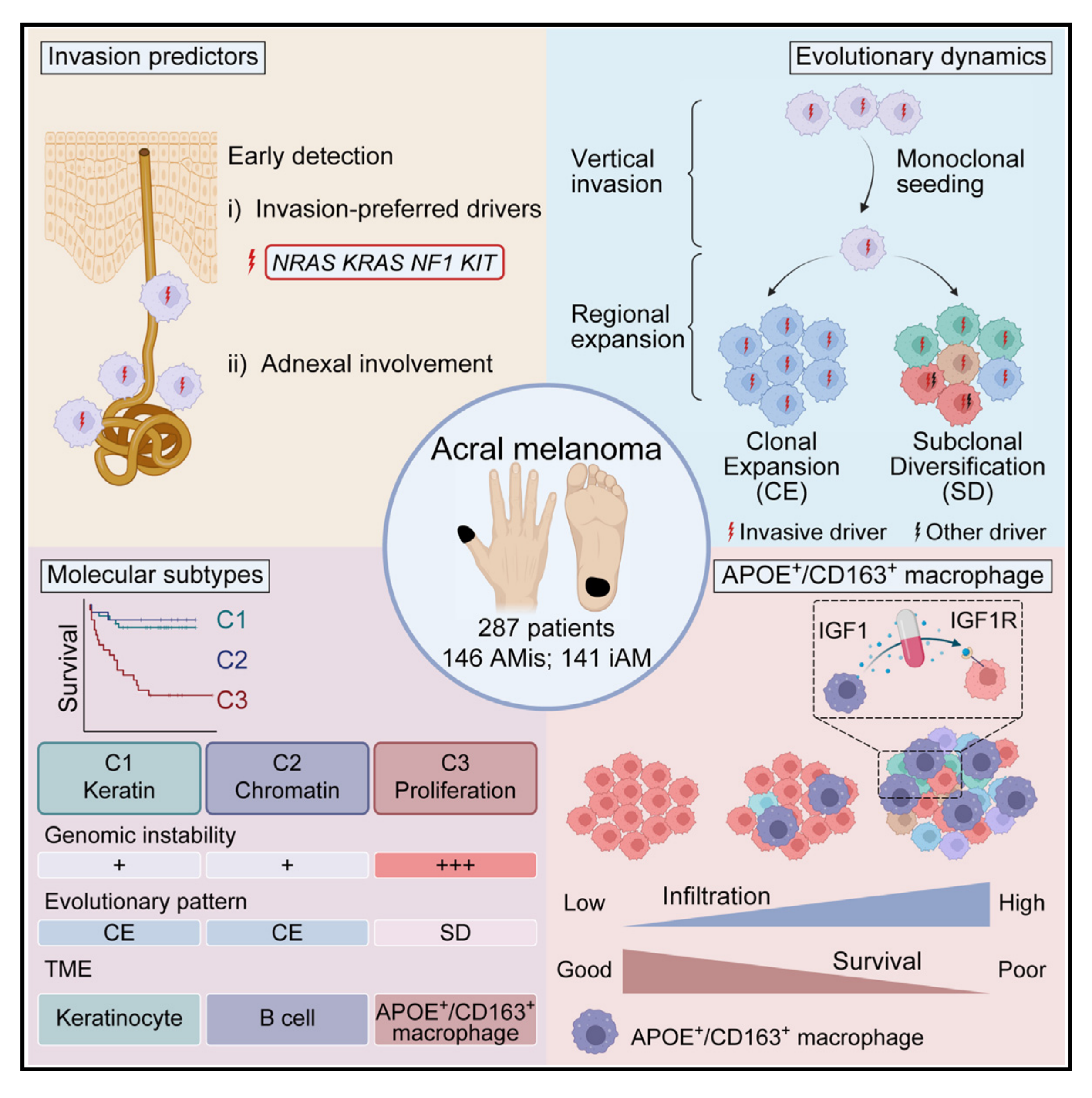 2024年5月16日,北京大學(xué)第一醫(yī)院的張寧、李航及北京大學(xué)-云南白藥國際醫(yī)學(xué)中心薛瑞棟團(tuán)隊合作在《Cancer Cell》在線發(fā)表題為《Integrative molecular and spatial analysis reveals evolutionary dynamics and tumor-immune interplay of in situ and invasive acral?melanoma》的研究論文,對肢端型黑色素瘤進(jìn)行了多組學(xué)分析,解析了從AMis進(jìn)展到iAM的克隆演化規(guī)律,建立了AM的分子分型,揭示了APOE+/CD163+巨噬細(xì)胞的空間富集狀態(tài),進(jìn)一步通過實驗證實該巨噬細(xì)胞亞群可通過IGF1-IGF1R互作促進(jìn)腫瘤發(fā)生上皮-間質(zhì)轉(zhuǎn)化,最終鑒定出附屬器受累和驅(qū)動突變可預(yù)測AMis的侵襲潛能,而APOE和CD163則可用于預(yù)測iAM的預(yù)后,為肢端型黑色素瘤的早期診斷和臨床診療提供了重要依據(jù)。
