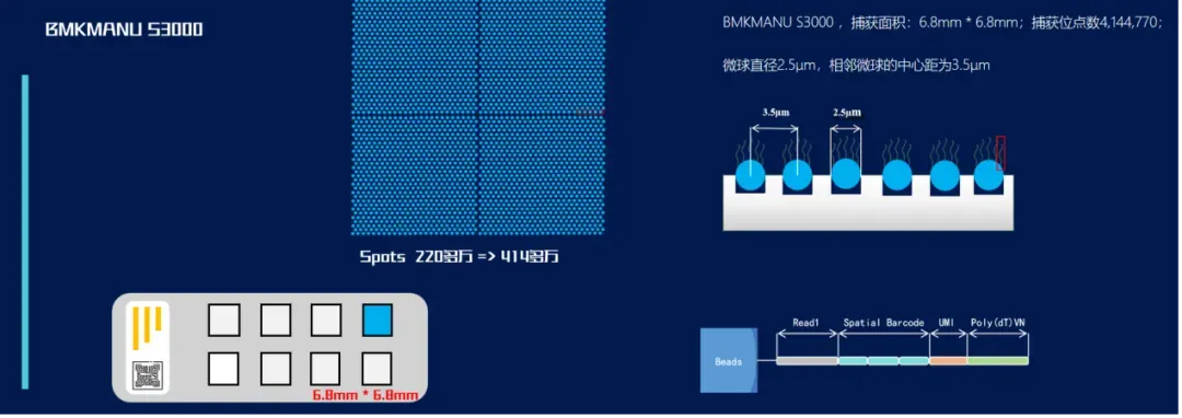 百創(chuàng)S3000在6.8mm*6.8mm 的捕獲區(qū)域內(nèi)鋪設(shè)了4,144,770個捕獲位點(diǎn),相鄰兩個捕獲位點(diǎn)的中心距為3.5μm。