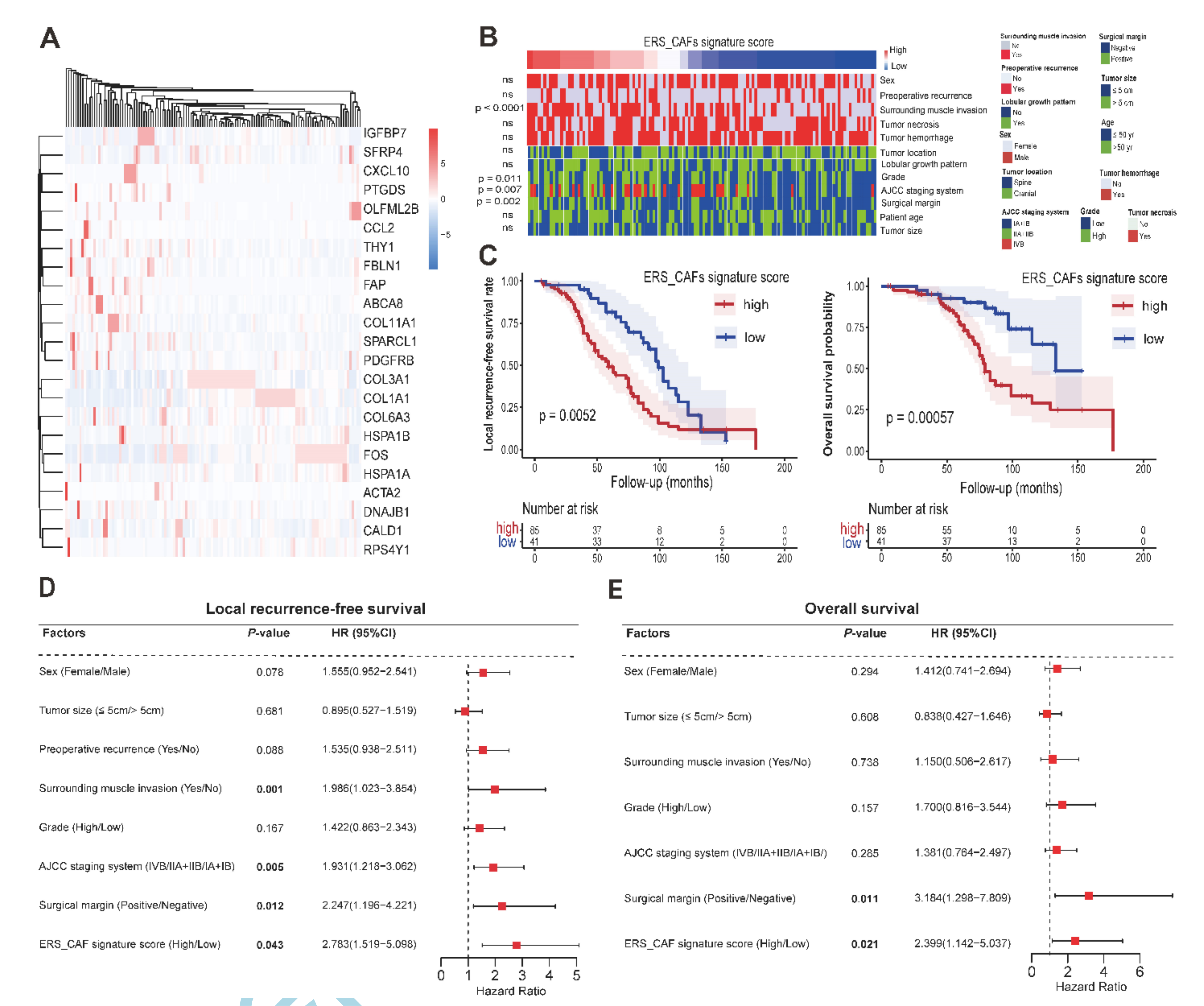 為了驗(yàn)證 ERS-CAF 的促腫瘤作用,該研究對(duì)來自脊索瘤患者的 126 個(gè)樣本進(jìn)行了總 RNA 測(cè)序(圖 4A)。使用代表該 CAF 子集的基因集計(jì)算每位患者的 ERS-CAF 特征評(píng)分,其中包括 ERS 相關(guān)基因(例如 HSPA1A、HSPA1B、CCL2 和 DNAJB1)和 CAF 特定標(biāo)記(例如 THY1、FAP、?和 COL1A1)。ERS-CAF 特征評(píng)分與臨床數(shù)據(jù)之間的關(guān)系如圖 4B 所示。如上所示,ERS-CAF特征評(píng)分與腫瘤侵犯周圍肌肉(P?<?0.0001)、腫瘤分級(jí)(P?=?0.011)、AJCC分期(P?=?0.011)顯著相關(guān)。P?=?0.007)和手術(shù)切緣(P?=?0.002)。與原發(fā)腫瘤患者相比,復(fù)發(fā)腫瘤患者的 ERS-CAF 特征較高(-0.06?±?0.53 vs. -0.10?±?0.51),但這種差異并不具有統(tǒng)計(jì)學(xué)意義(t?=?-0.404)?,p?=?0.687)。對(duì)于生存分析,作者使用在線平臺(tái)確定ERS-CAF特征評(píng)分的閾值,并根據(jù)截止點(diǎn)將患者分為高(>截止)和低(≤截止)亞組。Kaplan-Meier 分析表明,ERS-CAF 特征評(píng)分的增加可預(yù)測(cè)不利的 LRFS 和 OS(圖 4C),在控制 Cox 多元回歸模型中的重要臨床因素后,這一結(jié)果仍然顯著(圖4D–E)。這些數(shù)據(jù)表明使用 GSVA 特征來反映脊索瘤組織中的 ERS-CAF 亞群的可靠性,并強(qiáng)調(diào)了 ERS-CAF 在調(diào)節(jié)腫瘤進(jìn)展中的重要性。