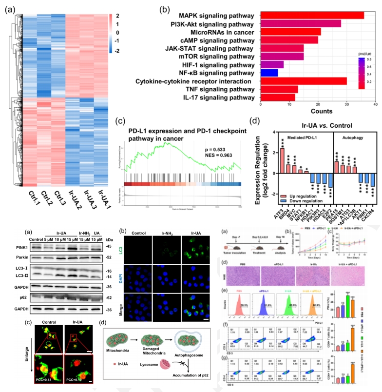 為了證明Ir-UA對PD-L1表達的強大調(diào)節(jié)能力,研究團隊進行了轉(zhuǎn)錄組分析,并比較了Ir-UA處理前后的基因表達情況,KEGG分析結(jié)果表明,癌癥進展的各種途徑顯著變化。例如,在Ir-UA處理后觀察到與PD-L1表達高度相關(guān)的信號通路,如磷脂酰肌醇3-激酶(PI3K)-AKT信號通路、Janus激酶/信號傳感器和轉(zhuǎn)錄激活因子(JAKSTAT)信號通路、絲裂原活化蛋白激酶(MAPK)信號通路等。此外,還檢測到控制先天或適應(yīng)性免疫細胞的信號通路,如核因子-κB(NF-κB)信號通路、細胞因子?細胞因子受體相互作用,白細胞介素17(IL-17)信號通路,腫瘤壞死因子信號通路等,它們對從“冷腫瘤”向“熱腫瘤”的轉(zhuǎn)變和克服αPD-L1耐藥性起到了重要作用。GSEA結(jié)果顯示吞噬小體和OXPHOS顯著富集,提示Ir-UA可能觸發(fā)自噬小體的形成并抑制OXPHOS。值得注意的是,包括ATF3在內(nèi),癌癥中的PD-L1的表達和PD-1檢查點通路也顯著富集,這些結(jié)果證實了IrUA增強了PD-L1相關(guān)基因的轉(zhuǎn)錄。細胞毒性評估結(jié)果顯示,與A549細胞相比,Ir-UA對正常HLF細胞的半抑制濃度高了5倍,據(jù)推測,利用PD-L1作為治療靶點,可能通過選擇性地調(diào)節(jié)TME中的免疫反應(yīng)來降低毒性。與Ir-NH2相比較,Ir-UA的親脂性以及A549細胞線粒體中的積累量均有明顯提升,進一步證實了Ir-UA具有較強的線粒體靶向能力。