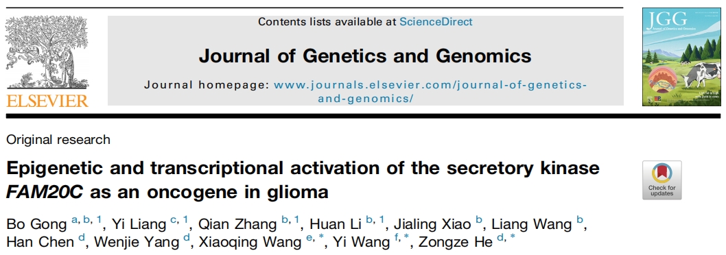 Gong B, Liang Y, Zhang Q, Li H, Xiao J, Wang L, Chen H, Yang W, Wang X, Wang Y, He Z. Epigenetic and transcriptional activation of the secretory kinase?FAM20C?as an oncogene in glioma.?J Genet Genomics. 2023 Jun;50(6):422-433. doi:10.1016/j.jgg.2023.01.008. Epub 2023 Jan 25.