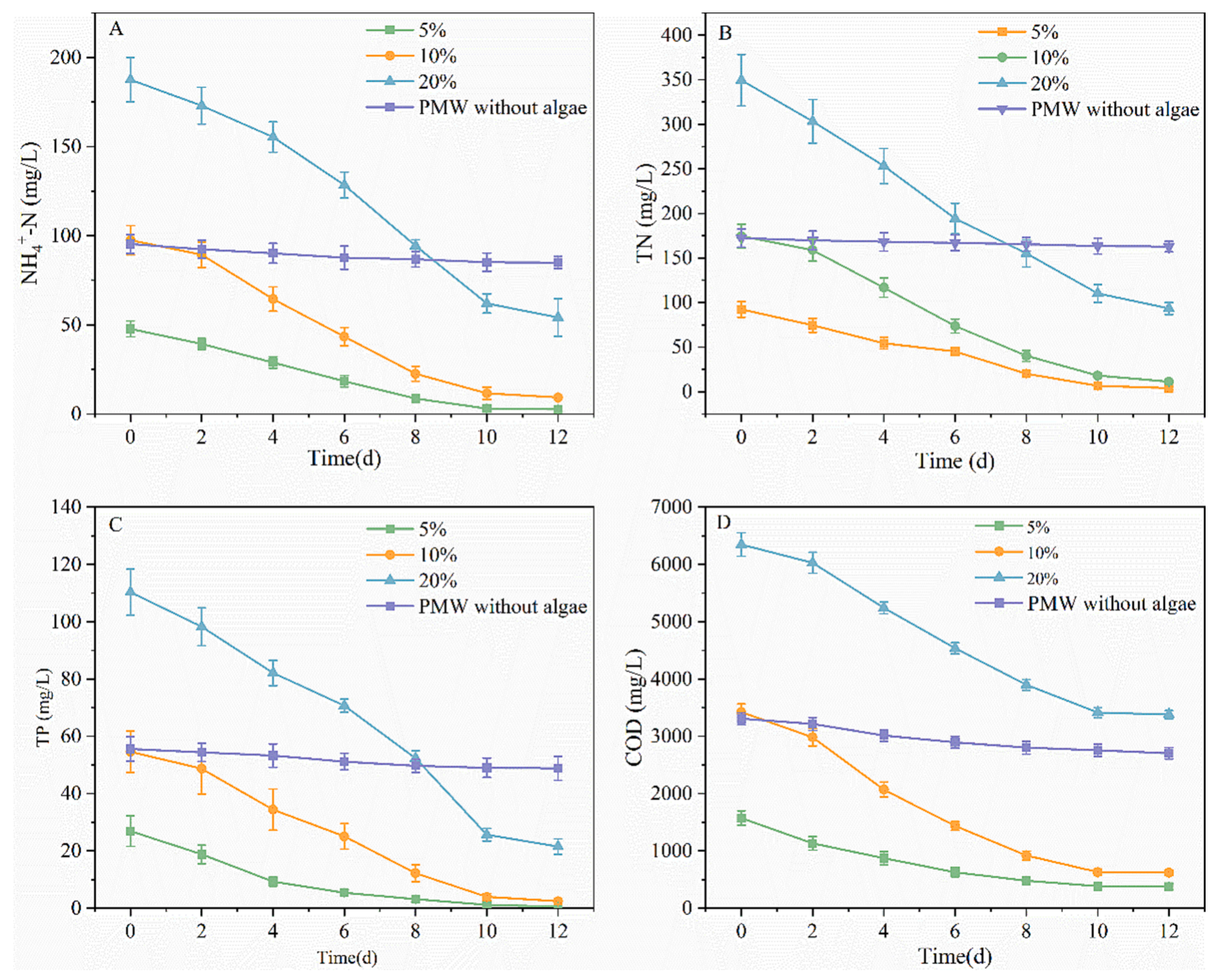 結(jié)果顯示,經(jīng)過12天的處理,原生微生物在10%的PMW中分別去除了6%、11%、12%和18%的TN、NH4+-N、總磷和COD(圖1)。這表明,雖然PMW中存在的原生細菌促進了營養(yǎng)物質(zhì)的去除,但硅藻在處理原料PMW中發(fā)揮了主要作用。根據(jù)上述結(jié)果和PMW的排放標(biāo)準,確定了10%的PMW是通過C. muelleri和細菌培養(yǎng)對PMW進行生物修復(fù)的最適宜濃度。