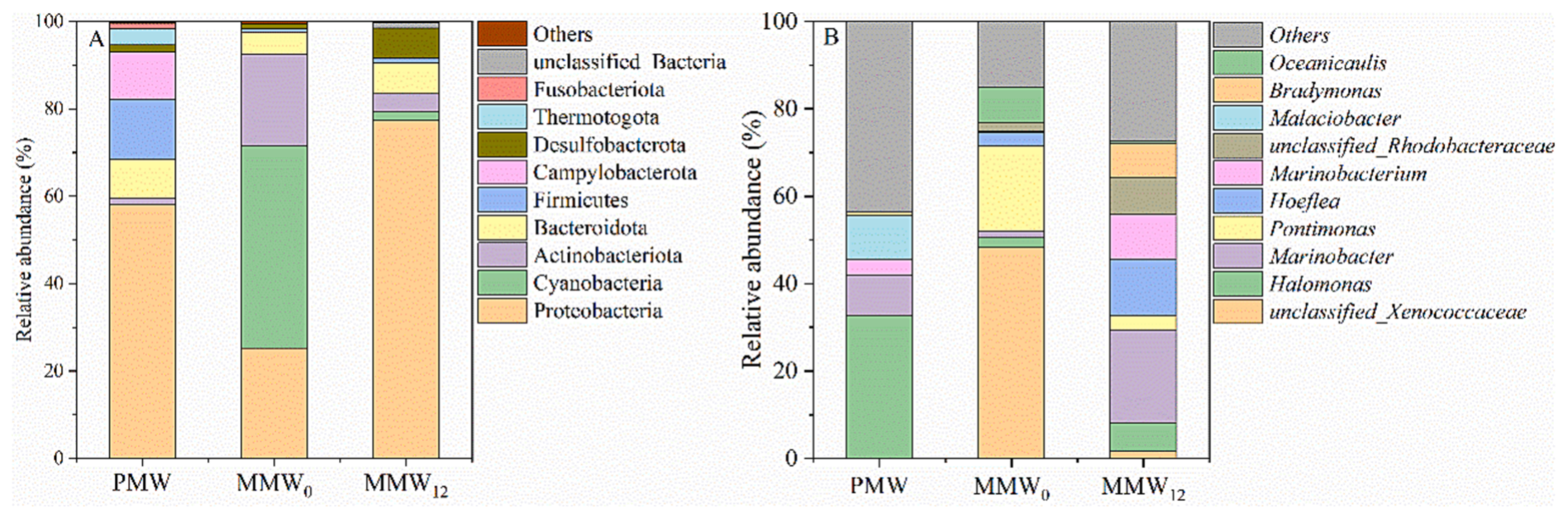 為了進一步明確細菌在系統(tǒng)中的作用,在門和屬水平上的10個優(yōu)勢分類群如圖5A和5B所示。Proteobacteria豐度在PMW中達到58%,與C. muelleri在MMW12共培養(yǎng)條件下增加到77%。變形桿菌中含有多種促進氮轉(zhuǎn)化和有機物降解的功能菌株。此外,與PMW相比,MMW12組放線菌和藍藻菌的豐度也有所增加。