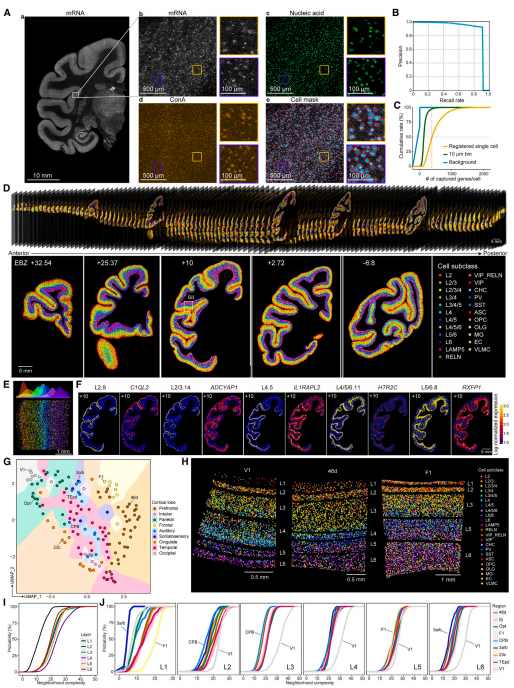 取樣策略:每隔500 μm取一次:包含兩個(gè)50 μm的大腦樣品切片進(jìn)行snRNA-seq+一張10 μm切片進(jìn)行空間轉(zhuǎn)錄組+兩張臨片切片進(jìn)行尼氏染色。獼猴#1 119張切片、獼猴#2 19張切片、獼猴#3 23張切片,共161張進(jìn)行空間轉(zhuǎn)錄組闡明大腦皮層的細(xì)胞組織是理解大腦結(jié)構(gòu)和功能的關(guān)鍵。在本研究中,研究人員利用大規(guī)模單核RNA測(cè)序和143個(gè)獼猴皮質(zhì)區(qū)域的空間轉(zhuǎn)錄組學(xué)分析,獲得了264種轉(zhuǎn)錄組定義的皮質(zhì)細(xì)胞類型的綜合圖譜,并繪制了它們?cè)谡麄€(gè)皮質(zhì)的空間分布。表征了谷氨酸能、氨基丁酸能和非神經(jīng)元細(xì)胞類型的皮質(zhì)層和區(qū)域偏好,以及細(xì)胞類型組成和“鄰域復(fù)雜性”的區(qū)域差異。值得注意的是,研究人員發(fā)現(xiàn)了視覺(jué)和體感系統(tǒng)中各種細(xì)胞類型的區(qū)域分布與區(qū)域等級(jí)水平之間的關(guān)系。來(lái)自人類、獼猴和小鼠皮層的轉(zhuǎn)錄組學(xué)數(shù)據(jù)的跨物種比較進(jìn)一步揭示了靈長(zhǎng)類特異性細(xì)胞類型在第4層富集,其標(biāo)記基因以區(qū)域依賴的方式表達(dá)。該研究數(shù)據(jù)為理解靈長(zhǎng)類動(dòng)物大腦的進(jìn)化、發(fā)育、衰老和發(fā)病機(jī)制提供了細(xì)胞和分子基礎(chǔ)。