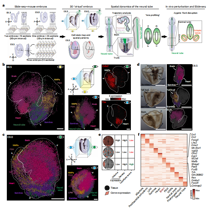 取樣策略:小鼠E8.5期胚胎:2個(gè)胚胎,15張10 μm切片,間隔30 μm;小鼠E9.0期胚胎:1個(gè)胚胎,26張10 μm切片,間隔20 μm;小鼠E9.5期胚胎:3個(gè)胚胎,13張10 μm切片在本研究中,研究人員使用Slide-seq技術(shù)構(gòu)建了完整胚胎E8.5和E9.0以及部分E9.5胚胎的空間轉(zhuǎn)錄組圖譜。為了支持該項(xiàng)研究的應(yīng)用,研究人員開(kāi)發(fā)了sc3D——一個(gè)重建和探索三維“虛擬胚胎”的工具,它可以定量研究區(qū)域化的基因表達(dá)模式。發(fā)育中的神經(jīng)管主胚軸的測(cè)量揭示了幾個(gè)以前未注釋的基因具有不同的空間模式。文章還描述了Tbx6突變胚胎中出現(xiàn)的“異位”神經(jīng)管的相互沖突的轉(zhuǎn)錄特性。綜上所述,文章提出了一個(gè)用于整個(gè)胚胎結(jié)構(gòu)和突變表型時(shí)空研究的實(shí)驗(yàn)和計(jì)算框架。