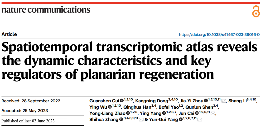 英文標(biāo)題:Spatiotemporal transcriptomic atlas reveals the dynamic characteristics and key regulators of planarian regeneration