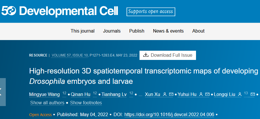 英文標(biāo)題:High-resolution 3D spatiotemporal transcriptomic maps of developing Drosophila embryos and larvae