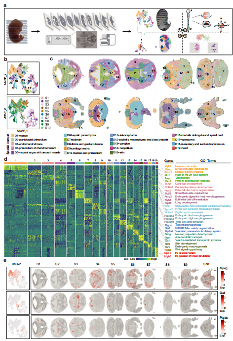取樣策略:E13.5小鼠胚胎沿顱尾軸連續(xù)冷凍切片,從中選10張10 μm切片進(jìn)行10x Visium空間轉(zhuǎn)錄組;雌性胚胎(E3)獲得了4個(gè)切片,以更好地覆蓋性別分化在本研究中,研究人員展示了小鼠胚胎第13.5天所有主要器官的空間轉(zhuǎn)錄組圖譜,并通過(guò)堆疊切片提供了胚胎模式分子調(diào)控的三維渲染。通過(guò)將空間圖譜與相應(yīng)的單細(xì)胞轉(zhuǎn)錄組學(xué)數(shù)據(jù)相結(jié)合,提供了一個(gè)詳細(xì)的關(guān)于器官發(fā)育動(dòng)態(tài)本質(zhì)的分子注釋,空間細(xì)胞相互作用,胚胎軸,以及哺乳動(dòng)物發(fā)育背后的細(xì)胞命運(yùn)分化,這將為精確的器官工程和基于干細(xì)胞的再生醫(yī)學(xué)鋪平道路。