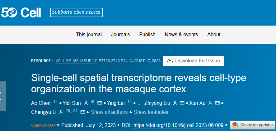 英文標(biāo)題:Single-cell spatial transcriptome reveals cell-type organization in the macaque cortex